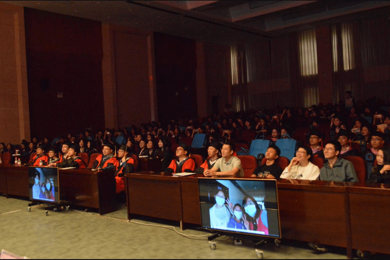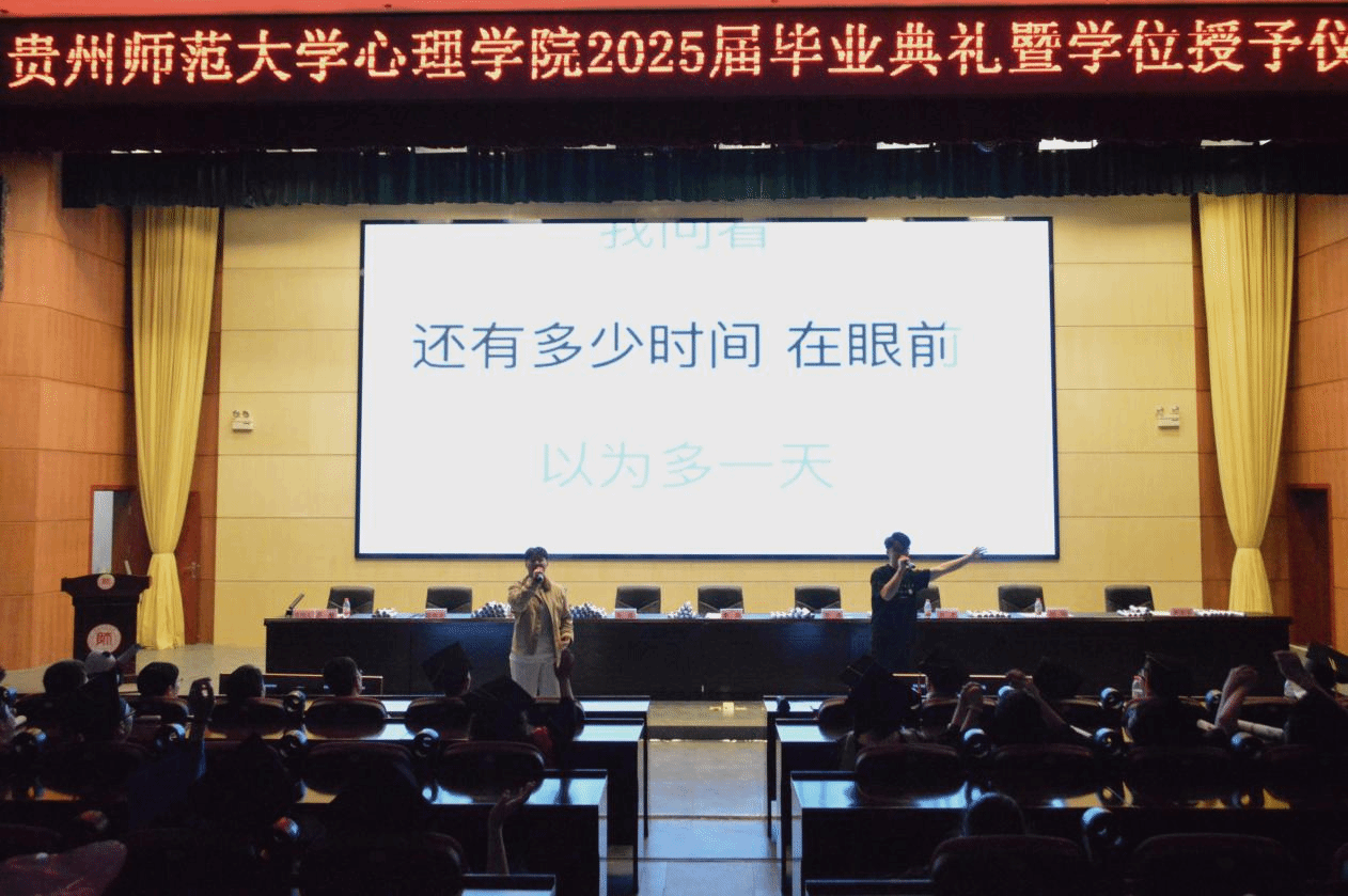 毕业视频中学子求学点滴,课堂钻研、师生互动和身穿毕业服的合影画面勾起满满回忆。视频结束后,学弟学妹带领全场齐唱《我们的明天》,以歌声传递祝福,最后高呼“祝学长学姐毕业快乐!”,真挚话语将现场氛围推向高潮 。