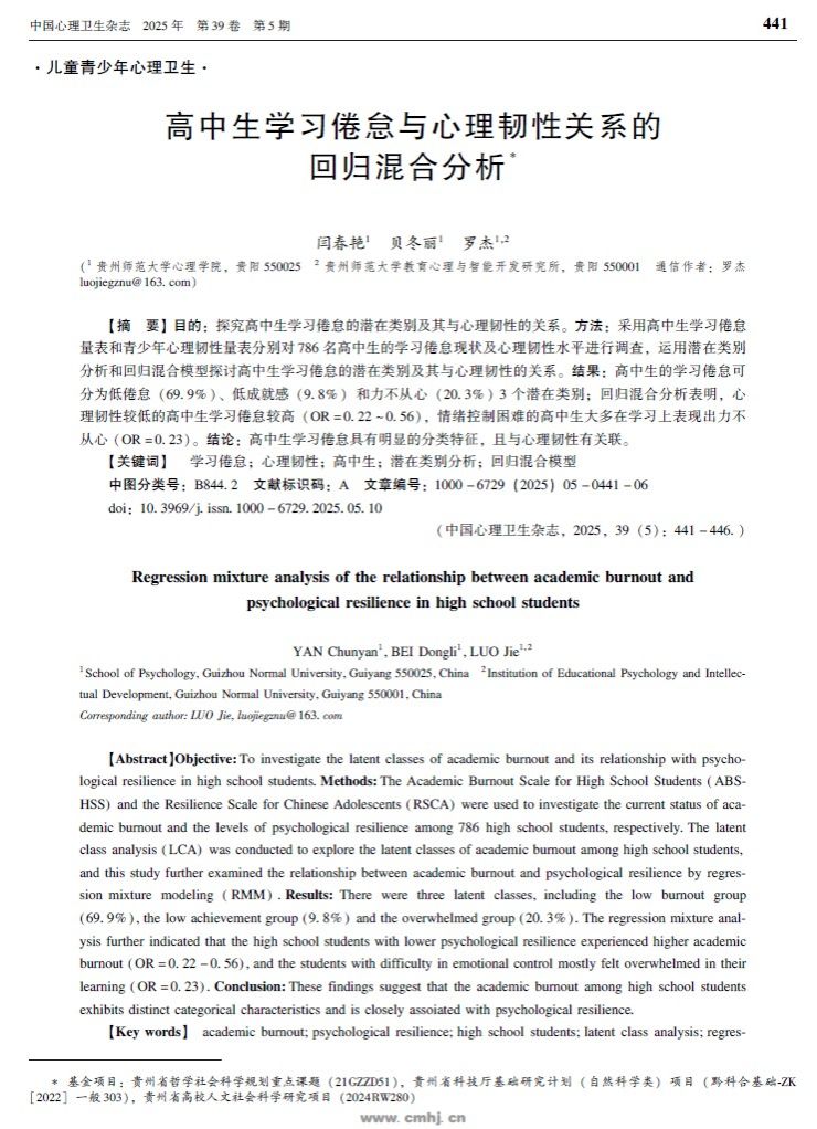2. 研究生闫春艳作为第一作者,罗杰教授作为通讯作者,2025年4月在北大核心期刊《中国心理卫生杂志》上发表了题为“高中生学习倦怠与心理韧性关系的回归混合分析”的研究论文。研究发现,高中生学习倦怠具有明显的分类特征,且与心理韧性有关联。