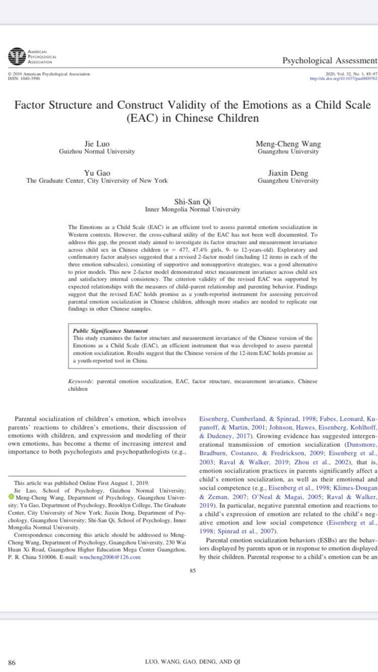热烈祝贺公司罗杰副教授以第一作者、第一单位在SSCI一区杂志《Psychological Assessment》发表题为“Factor Structure and Construct Validity of the Emotions as a Child Scale (EAC) in Chinese Children”的论文。
