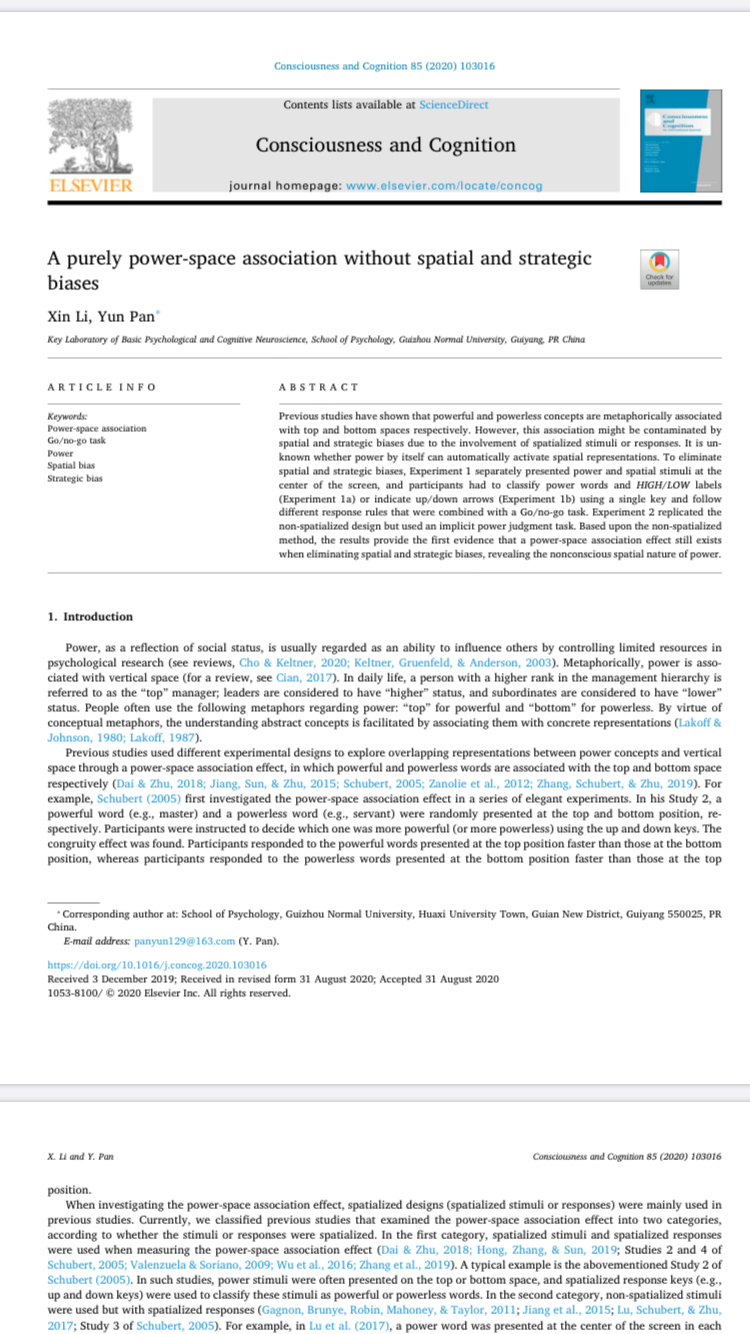 二、李欣(第一作者,2018级硕士研究生)、潘运教授(通讯作者)在《Consciousness and Cognition》杂志(SSCI二区)2020年第10期发表题为“A purely power-space association without spatial and strategic biases”论文。
