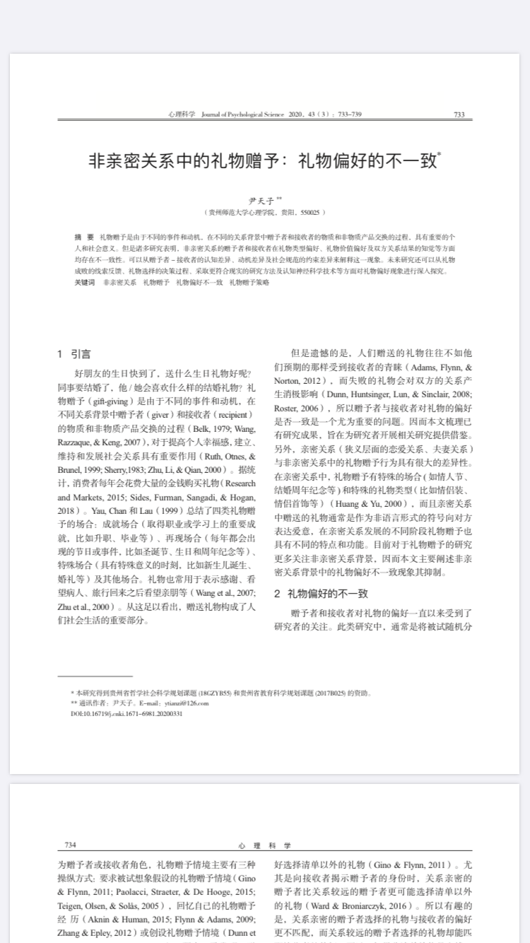 四、尹天子副教授在《心理科学》杂志发表题为“非亲密关系中的礼物赠予:礼物偏好的不一致”论文。