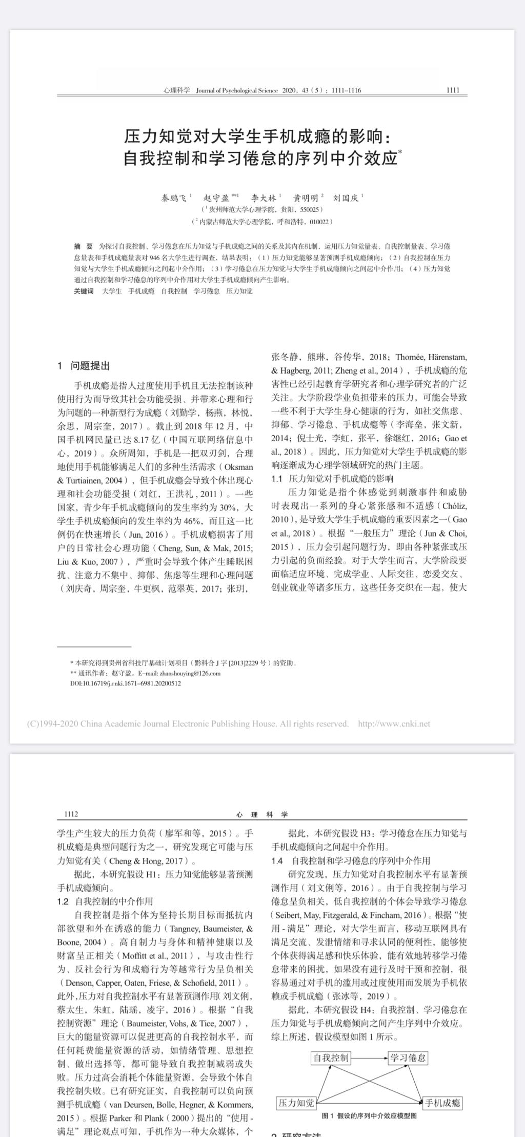 三、秦鹏飞(第一作者,2017级硕士研究生)、赵守盈教授(通讯作者)在《心理科学》杂志发表题为“压力知觉对老员工手机成瘾的影响:自我控制和学习倦怠的序列中介效应”论文。