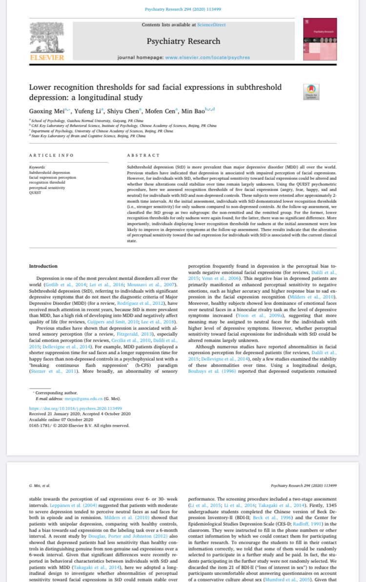 一、梅高兴副教授在《Psychiatry Research》杂志(SSCI二区)发表题为“Lower recognition thresholds for sad facial expressions in subthreshold depression: a longitudinal study”论文。