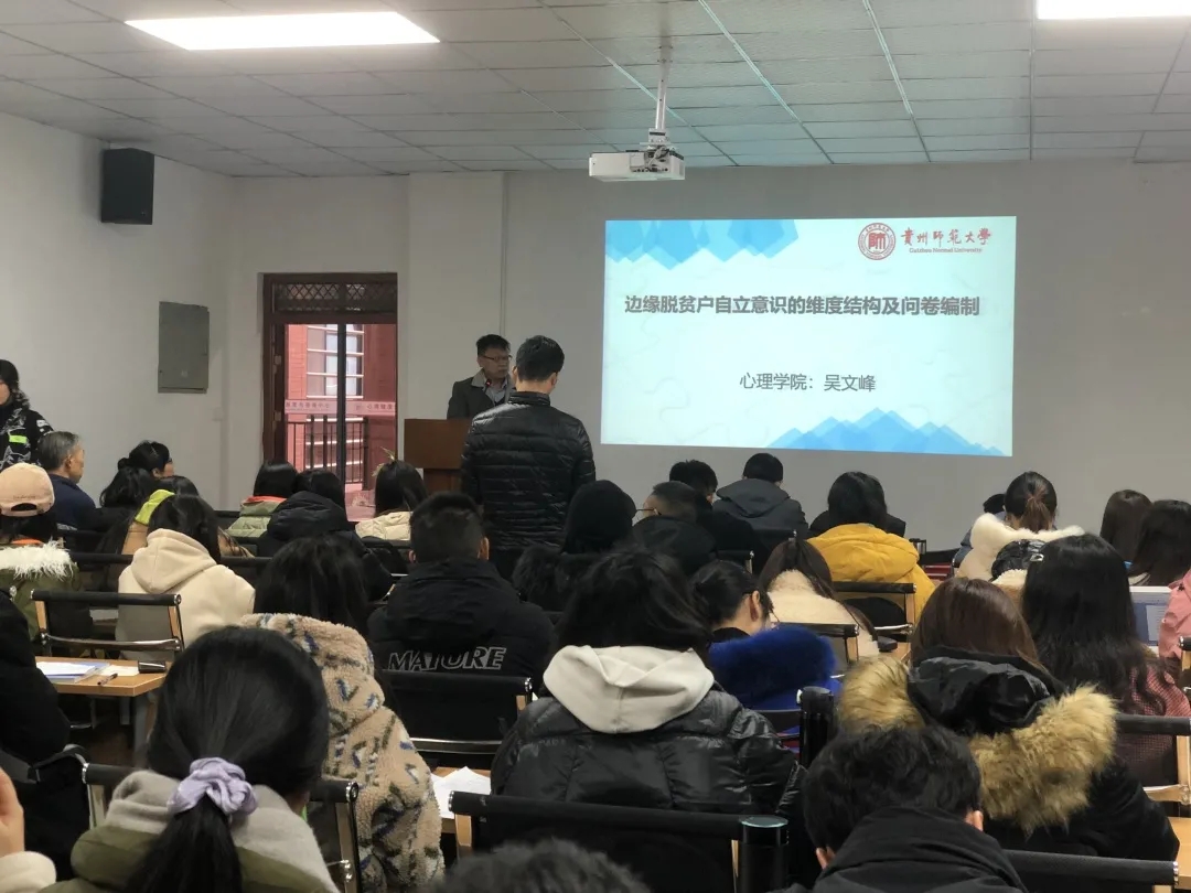 吴文峰老师作了题为“边缘脱产户自立意识的维度结构及问卷的编制”的报告,他分别从研究背景、理论构建、问卷条目收集和问卷初测分析四个方面进行了阐述。吴老师强调述清概念的重要性,针对贫困心理研究和自立人格结构的一些理论基础来帮助听众更好地理解研究内容。吴老师详细的讲解使同学们掌握了一个量表是如何编制以及验证的。