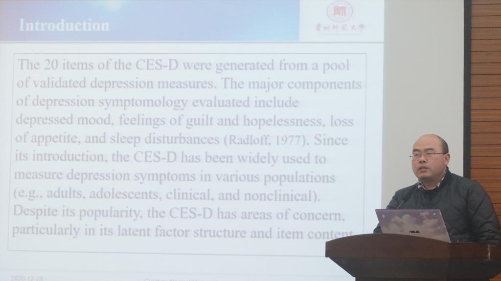 学术交流环节阶段,主要以“‘十四五’时期贵州省社会心理服务体系完善与提升”为主题展开交流研讨。mk官网首页罗杰老师、杨超老师分别作了《Factor structure of the Center for Epidemiological Studies Depression Scale (CES-D):An exploratory structural equation modeling》和《社区责任感的结构及其对居民利他行为的影响机制研究》的主题报告。