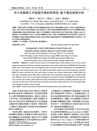 6.曾练平副教授作为第一作者,在CSSCI期刊《中国临床心理学杂志》发表了题为“中小学教师工作家庭平衡的异质性:基于潜在剖面分析”的学术论文。