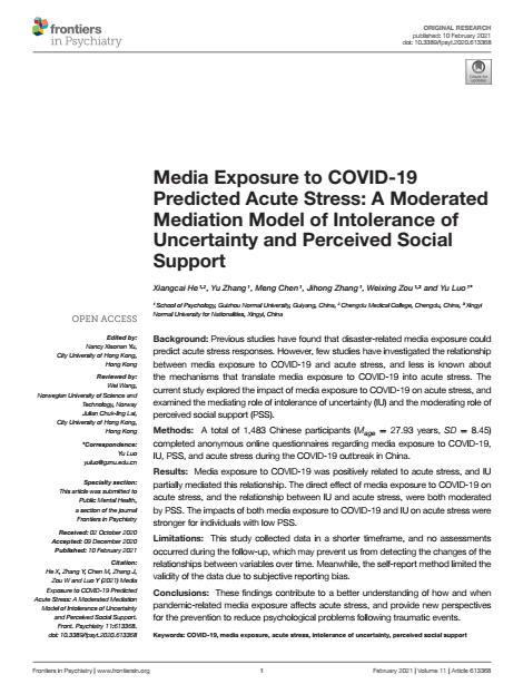 3.2019级博士研究生何相材作为第一作者,罗禹副教授作为通讯作者,在SSCI二区期刊《Frontiers in Psychiatry》发表了题为“Media Exposure to COVID-19 Predicted Acute Stress: A Moderated Mediation Model of Intolerance of Uncertainty and Perceived Social Support”的学术论文。