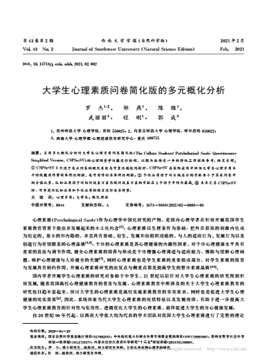7.罗杰副教授作为第一作者,程刚副教授作为通讯作者,在核心期刊《西南大学学报》自然科学版,发表了题为“老员工心理素质问卷简化版的多元概化分析”的学术论文。