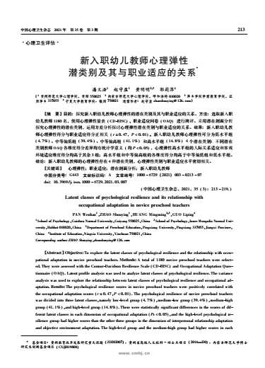 5.2018级硕士研究生潘文浩作为第一作者,赵守盈教授作为通讯作者,在专业核心期刊《中国心理卫生杂志》发表了题为“新入职幼儿教师心理弹性潜类别及其与职业适应的关系”的学术论文。