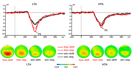 研究分析了高低焦虑组在win-stay, win-shift, loss-stay, loss-shift下的脑电特征及行为-脑电相互关系,并分别对表征结果预期FRN和信息更新P3这两种核心脑电成分进行了溯源分析。结果表明,相对于低焦虑人群,高焦虑人群往往对结果预期更加悲观,面对负性结果时更不愿意及时调整以止损。