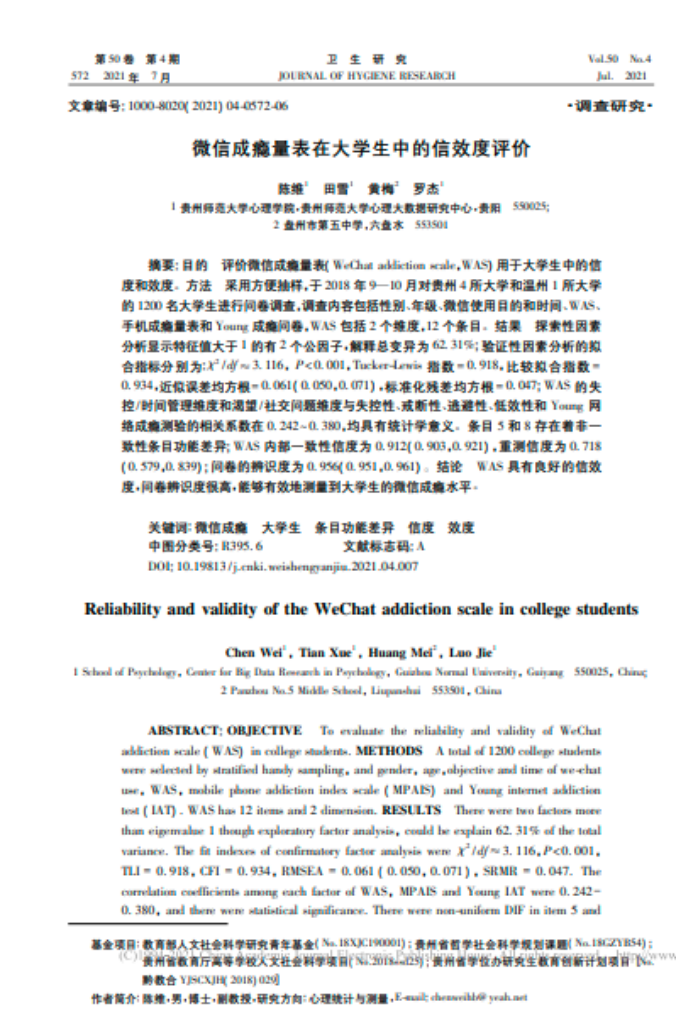 13.陈维副教授作为第一作者,2021年7月在CSCD期刊《卫生研究》发表了题为“微信成瘾量表在老员工中的信效度评价”的学术论文。
