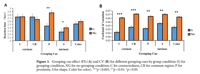 该研究从数字认知的角度去探讨数量感知的“分组化”策略。在估计一组数组数量的多少时,通过将数组划分为几组子组,可以快速准确地估计数组中的项目数,这种策略称为“分组化”。以往研究调查了“分组化”对内在分组线索的影响。然而,还没有研究探讨外在分组线索的分组效应。因此,该研究探讨了在数量感知的分组化效应中,外在分组线索是否不同于内在分组线索,为数量感知“分组化”策略的研究提供了新的思路。