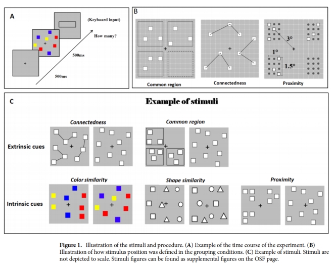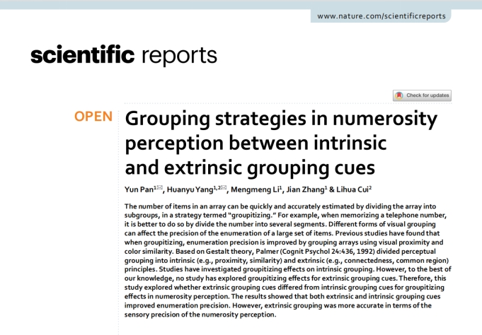 近日,mk体育潘运教授等人在SCI1区期刊Scientific Reports (IF=4.379)在线发表题为“Grouping strategies in numerosity perception between intrinsic and extrinsic grouping cues”的研究论文。