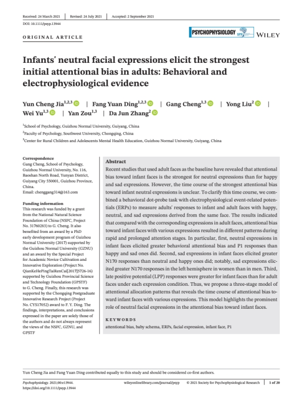 近期,mk体育程刚副教授及其团队在国际期刊Psychophysiology(2020 IF=4.016, JCR SCI&SSCI1区,中科院心理学2区TOP)在线发表题为“Infants’ neutral facial expressions elicit the strongest initial attentional bias in adults: Behavioral and electrophysiological evidence”的学术论文。