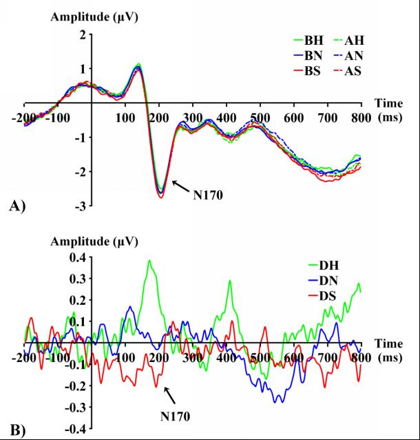 图3 婴儿和成人面孔在高兴、中性或悲伤表情上诱发的N170成分(P7、P8、PO7和PO8电极在170~230毫秒时间窗内的平均振幅)的组平均事件相关电位波形