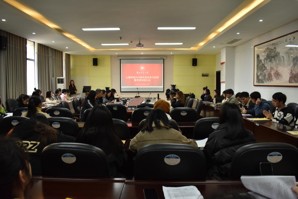 12月22日,mk体育在公司三楼会议室召开了2018级毕业生实习总结暨考研冲刺大会。mk体育官方网站入口党委副书记饶蕾,副经理罗禹、陈维,团队建设主任曾练平,心理学系主任罗杰,教学管理科科长盖磊,公司实习指导老师代表,2018级辅导员张晓芬及2018级全体同学参会。会议由陈维主持。
