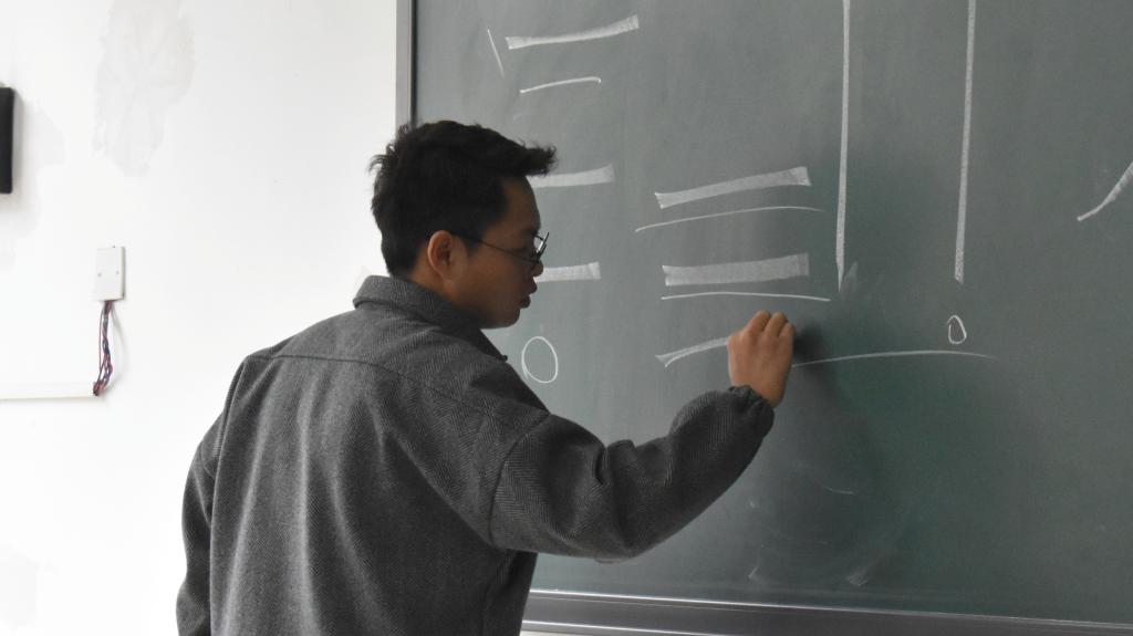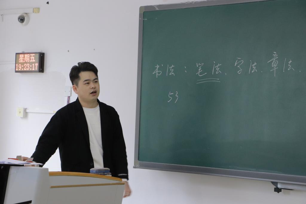 何陈竹老师指导粉笔字训练。他给同学们介绍正确的握笔姿势,并针对五个基本笔画进行指导。何老师选择不同结构的字讲解字体的结构分析,在演示过程中,他强调粉笔字需要布局合理,行列整齐,同时要根据笔画的走向,改变下笔的轻重。