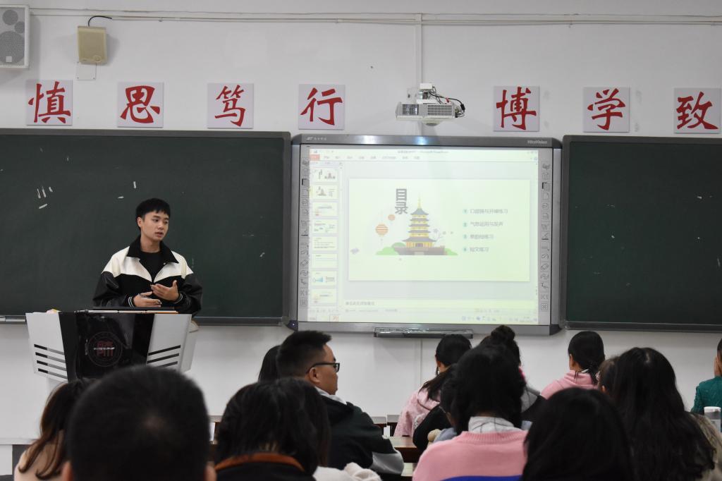 贺石东老师和祖成毅老师带领同学们进行普通话的发声发音技巧与训练。贺石东老师通过同学们的自我介绍,发现并纠正发声问题,指导大家练习气泡音、口部操和胸腹联合式呼吸,学习如何开嗓和正确运用气息的方法,借助调值图和运用短文练习纠正同学们的发音声调,领会朗读文章的处理技巧。祖成毅老师向同学们介绍了普通话的基本概念和声母、韵母的分类以及分析发音的重难点。让同学们依次朗读含有平翘舌音、鼻边音、唇齿音等特殊音节的字词,纠正同学们发音时所存在的音变和错误声调。