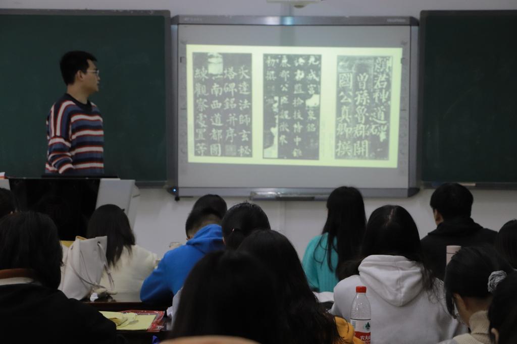 沈淮虎老师指导毛笔字练习。他给同学们简单介绍了楷书四大书法家,并针对“笔法”进行讲解。他强调书法讲究计白当黑、布白均匀,以颜体楷书为例,详细地演示了笔画的运笔过程,并对同学们的毛笔书写进行了指导,根据同学们提出的书写过程中的问题进行点评、答疑。