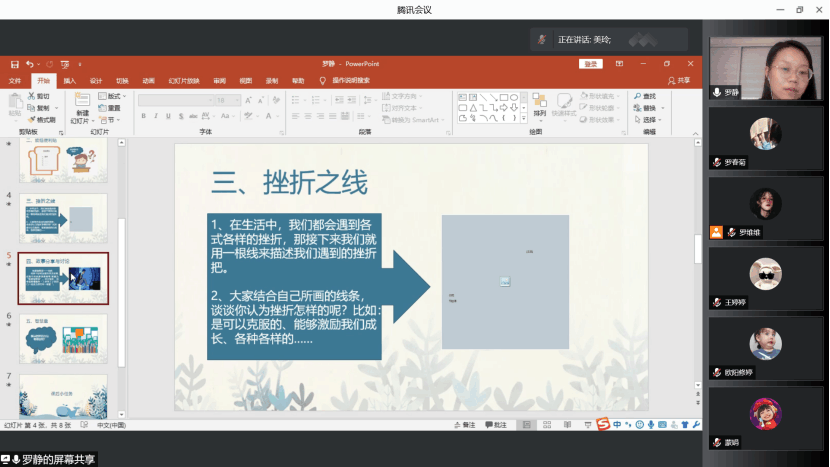 罗静:1.要把规则说清楚,可以示范2.图重点突出挫折,挫折应对的方法要讲3.突出挫折与生命的关系。