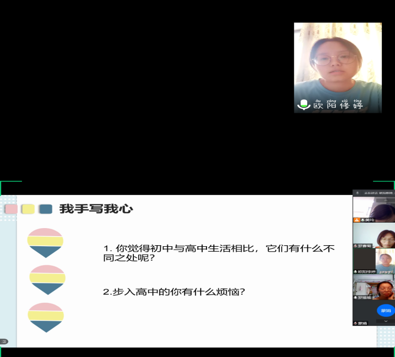 欧阳修婷:此次培训中,我对自己设计的课程进行了一个简单的阐述,在 老师同学们的建议下,我深刻认识到了自己设计课程的不足,也针对自己课程设计中出现的活动设计内容不衔接,实际性问题考虑不周到进行了反思,接下来将自己的课程进一步修改和完善,同时从其他同学的讲解和老师的点评中也收获了很多。