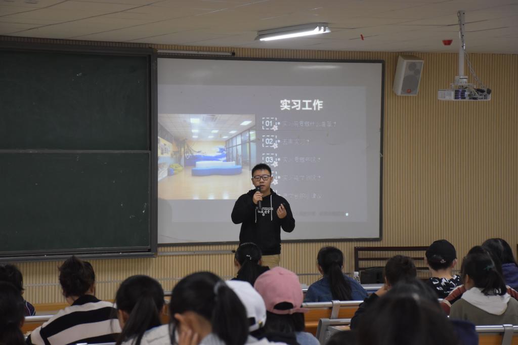 孙思博从实习前准备、具体实习地方、实习需要做的工作、在实习过程中能学到的东西以及个人收获等五个方面来展开分享。首先,就实习前的准备而言,建议同学们平时注意自我能力的培养和专业素质的提升。接着,给同学们分享了在实习公司中的主要工作包括:给员工上心理健康课堂、员工心理咨询、班主任工作及相关德育工作等。同时,也分享了自己在实习过程中遇到的一些问题及解决策略,他谈到,在实习的这个过程中,对中小学心理健康工作有了更深刻的理解,对“理论与实践”的关系也有了一个较为清晰的区分。最后,孙思博建议同学们在大学的学习生活中,要不断挖掘自己的长处,并争取锻炼成长的机会。同时,也要善于接纳自己的短处,勇于尝试,不断挑战自己并总结反思,获得自我提升。