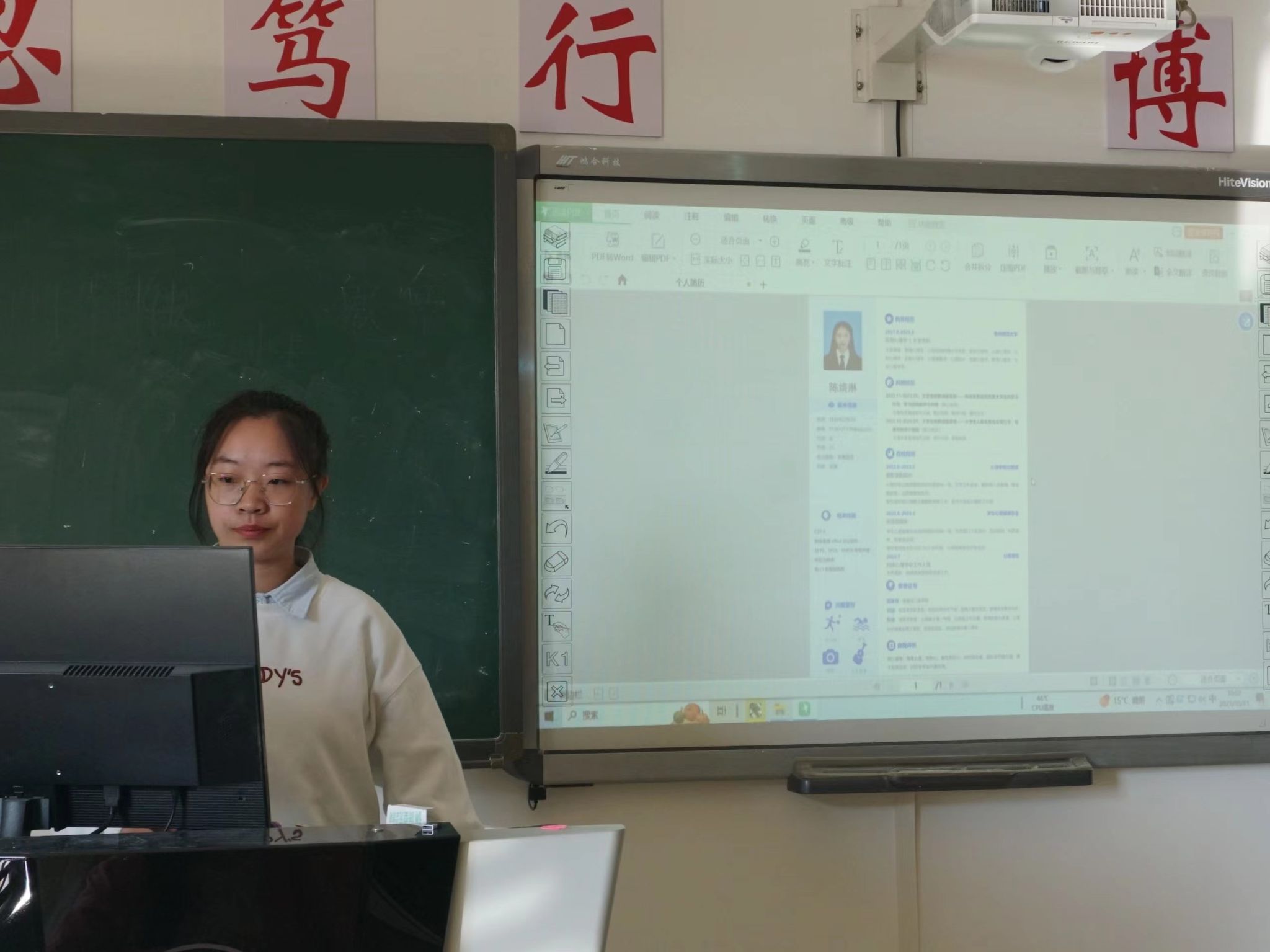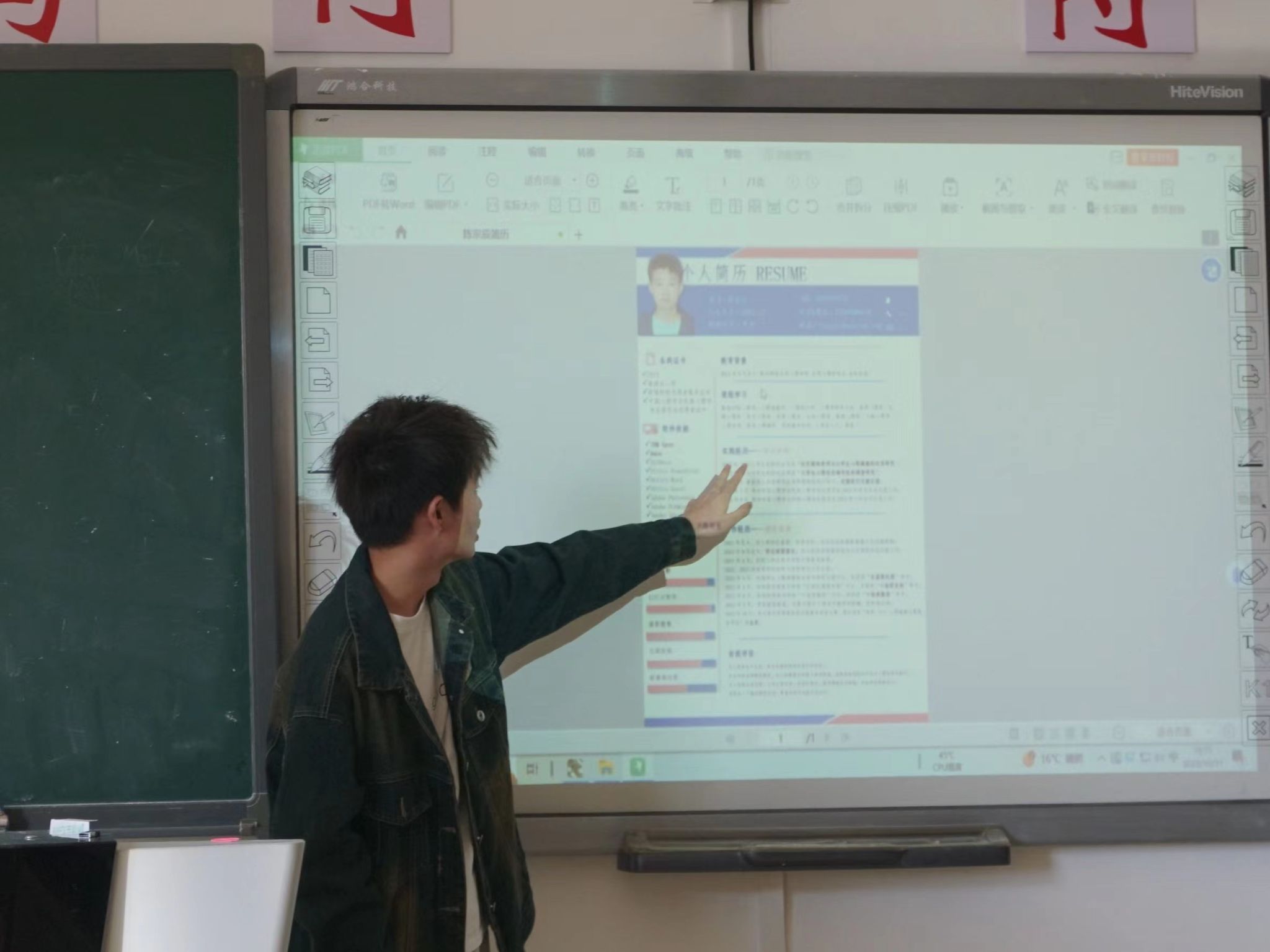 31日上午,高阳为2021级全体同学开展培训。本次课堂采用讲、评、改的方式进行。高阳随机抽选同学上台展示自己制作的简历并进行讲解介绍。同学们分别从简历投递方向、版面设计思路、内容分布思路、内容中某个亮点阐述四个方面进行说明。随后,高阳对同学们的简历进行细致点评,并提出相应修改意见。高阳希望同学们结合讲解案例对照自己的简历取长补短,不断优化。