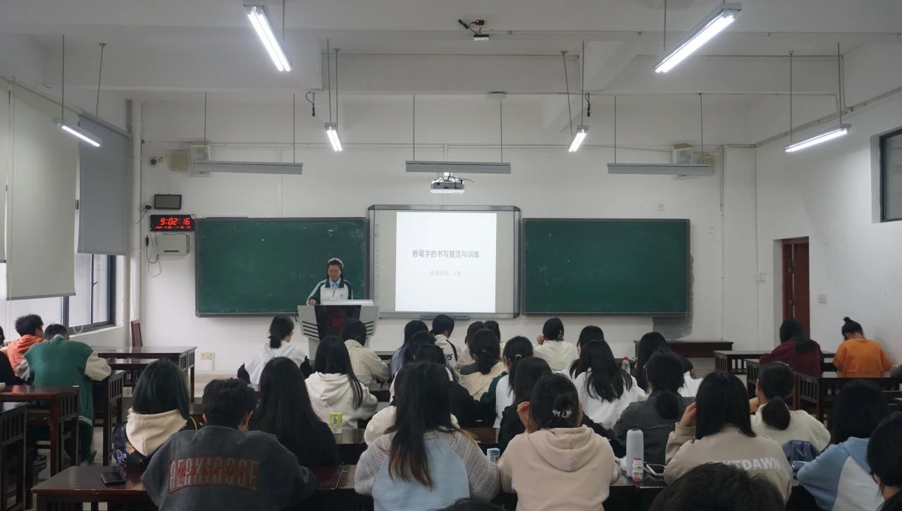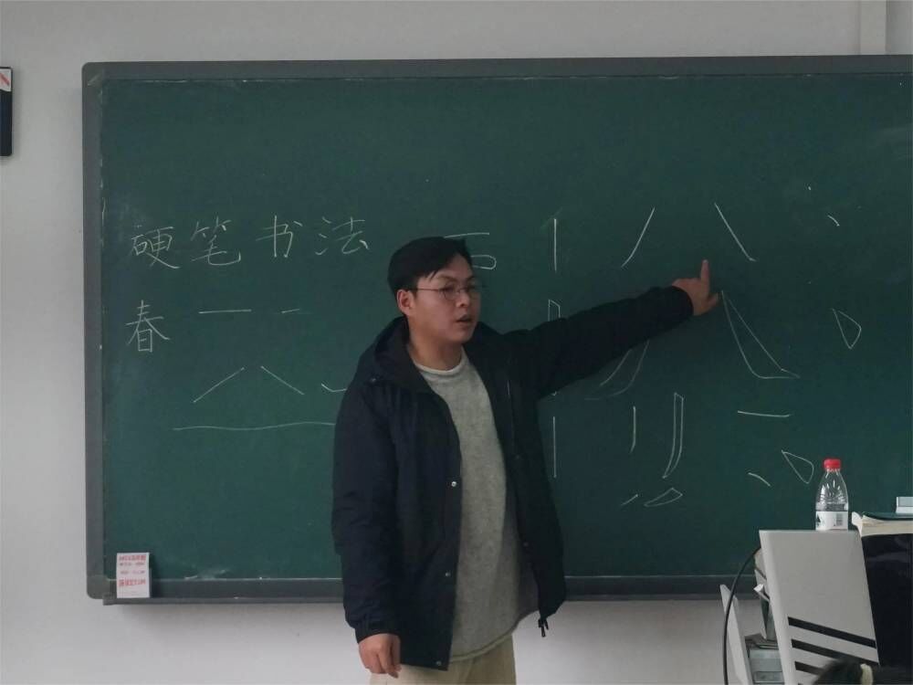硬笔字培训由何陈竹老师主持。何老师首先对握笔姿势、书写范围、汉字结构等进行详细地讲解和示范。随后,针对基础笔画进行了重点教学,引导同学们从基础入手,观摩学习书法大家作品,最终达到书写规范、自成风格的效果。