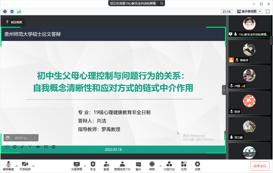 参与本次预答辩的2022届硕士研究生共计69人,涉及学术、专业硕士两个类别,5个专业,共分为6组(包含4个线下和2个线上),每组有3位答辩委员参与评审,硕士研究生一、二年级的同学参加了答辩会议并认真观摩学习。参加答辩的同学们从选题的目的、意义、研究思路、研究内容等方面对各自的学位论文进行了详细阐述,答辩委员们根据同学们上交的论文和汇报情况,分别提出了针对性的修改意见。