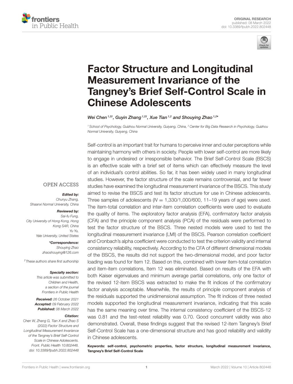 2.硕士研究生张谷吟与陈维教授作为共同第一作者,赵守盈教授(副董事长)作为通讯作者,2022年3月在SSCIJCR一区期刊《Frontiers inPublicHealth》发表了题为“Factor Structure and Longitudinal Measurement Invariance of the Tangney’s Brief Self-Control Scale in Chinese Adolescents”的学术论文。论文主要在国内青少年群体中修订了简式自我控制量表,并检验了它的信效度以及纵向不变性。