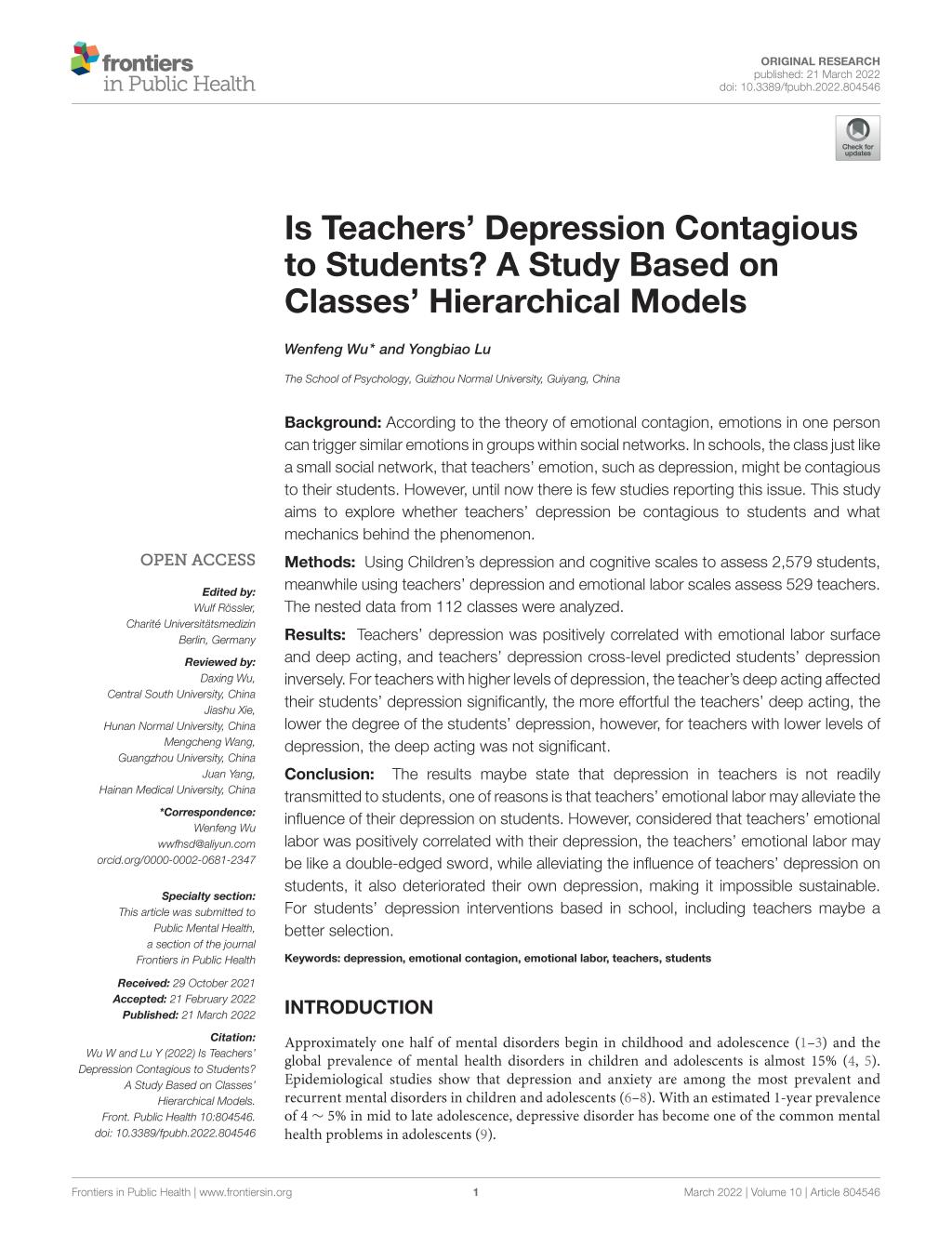 3.吴文峰教授作为第一作者,卢永彪副教授作为第二作者,2022年3月在SSCIJCR一区期刊《Frontiers inPublicHealth》发表了题为“Is Teachers' Depression Contagious to Students? A Study Based on Classes' Hierarchical Models”的学术论文。论文主要探讨班级环境中教师抑郁是否会传染给员工这一重要问题。研究发现,教师抑郁并不会直接传染给员工,相反,班级中教师抑郁症状程度越高,员工的抑郁症状程度反而越低。研究还发现,教师情绪劳动具有跨班级层的调节作用,即高抑郁症状教师情绪劳动付出越多,其班级员工抑郁症状程度越低。由于研究发现教师情绪劳动付出与其抑郁症状程度显著正相关,因此,在公司管理中,应在看到教师情绪劳动有利于员工的同时,关注其可能对教师本身的负面影响,并通过一定的干预措施强化对教师情绪劳动付出的补偿。