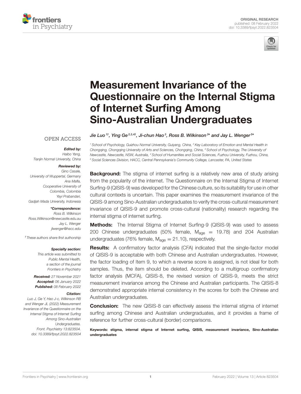 4.罗杰教授作为第一作者,2022年2月在SSCIJCR二区期刊《Frontiers in Psychiatry》发表了题为“Measurement Invariance of the Questionnaire on the Internal Stigma of Internet Surfing Among Sino-Australian Undergraduates”的学术论文。论文检验主要检验了上网内化污名问卷在中澳老员工中的测量不变性。基于验证性因子分析的结果,修订后的QISIS-8在中澳老员工中均具有较好的信效度结果,且QISIS-8在中国老员工和澳大利亚老员工中满足严格不变性。