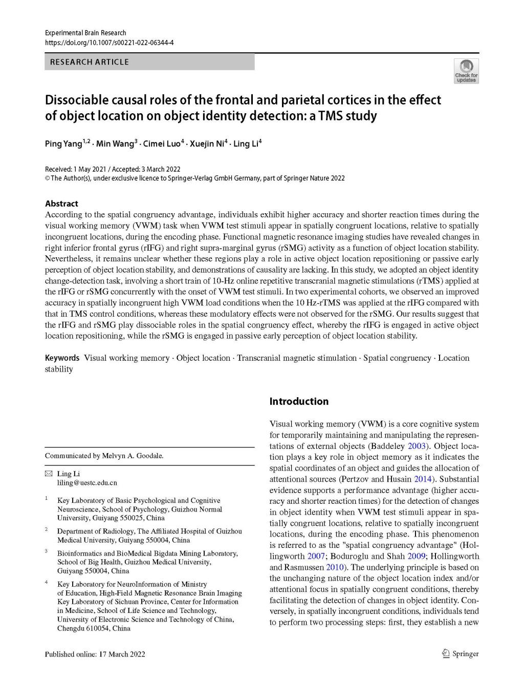 7.杨平副教授作为第一作者,2022年3月在SCIJCR四区期刊《Experimental Brain Research》发表了题为“Stable abnormalities of contrast discrimination sensitivity in subthreshold depression: A longitudinal study”的学术论文。视觉工作记忆中客体空间一致性优势效应表明,当测试客体与编码客体空间一致时,相对于空间不一致条件,个体在工作记忆任务中表现出更高的准确率和更短的反应时间。fMRI研究表明右额下回(rIFG)和右缘上回(rSMG)调制了客体空间一致性效应。本研究采用rTMS干预上述脑区,结果发现rTMS刺激rIFG提高了空间不一致条件下工作记忆准确率,而刺激rSMG无此效应。我们推断rIFG和rSMG在空间一致性优势效应中发挥了不同的作用,即rIFG主要参与了空间不一致条件下的空间重定位作用。