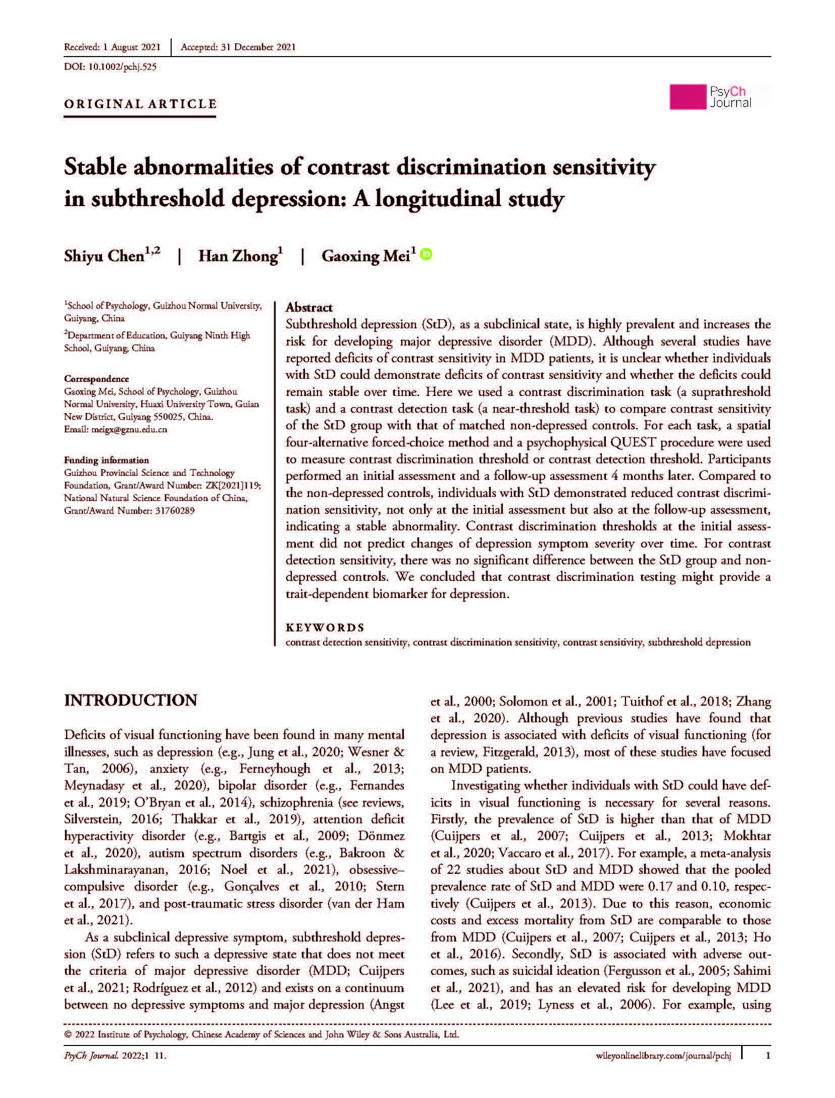 6.硕士研究生陈仕语作为第一作者,梅高兴教授作为通讯作者,2022年2月在SSCIJCR三区期刊《Psych Journal》发表了题为“Stable abnormalities of contrast discrimination sensitivity in subthreshold depression: A longitudinal study”的学术论文。研究采用心理物理自适应知觉阈限测量程序—QUEST法—比较了阈下抑郁组个体和健康对照组个体在对比度敏感性上(包括比度差别阈限敏感性和对比度绝对阈限敏感性)的差异,以及这种差异是暂时性的还是稳定性的。结果发现,不管是在初测测试中还是在追踪测试中,与健康对照组个体相比,健康对照组个体均显示出更弱的对比度差别阈限敏感性。而且,个体的抑郁分数越高,越倾向于表现出更高的对比度差别阈限(也就是更低的差别阈限敏感性)。但是在对比度绝对阈限敏感性任务中,两组被试并没有表现出显著差异。这些研究结果表明,对比度差别阈限敏感性可以作为区分阈下抑郁个体和健康个体的行为学测量指标。
