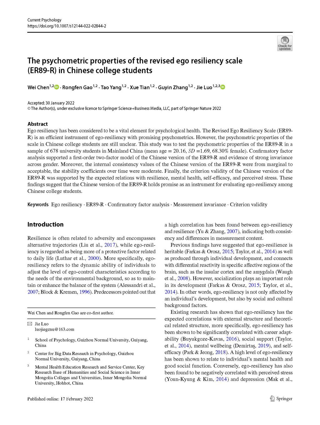 1.陈维教授作为第一作者,罗杰教授作为通讯作者,2022年2月在SSCIJCR一区期刊《Current Psychology》发表了题为“The psychometric properties of the revised ego resiliency scale (ER89‑R) in Chinese college students”的学术论文。论文考察自我韧性量表修订版(ER89-R)在中国老员工中的心理测量学属性。验证性因子分析支持ER89-R的一阶两因子结构且该结构满足跨性别的强不变性;ER89-R的内部一致性系数介于边缘到可接受之间,稳定性系数适中;ER89-R得分与心理弹性、心理健康、自我效能感和感知压力等效标之间存在相关。