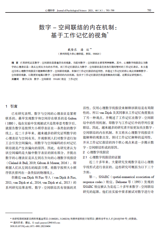 3.研究生戴隆农作为第一作者,潘运教授作为通讯作者,2021年7月在CSSCI期刊《心理科学》发表了题为“数字-空间联结的内在机制:基于工作记忆的视角”的学术论文。