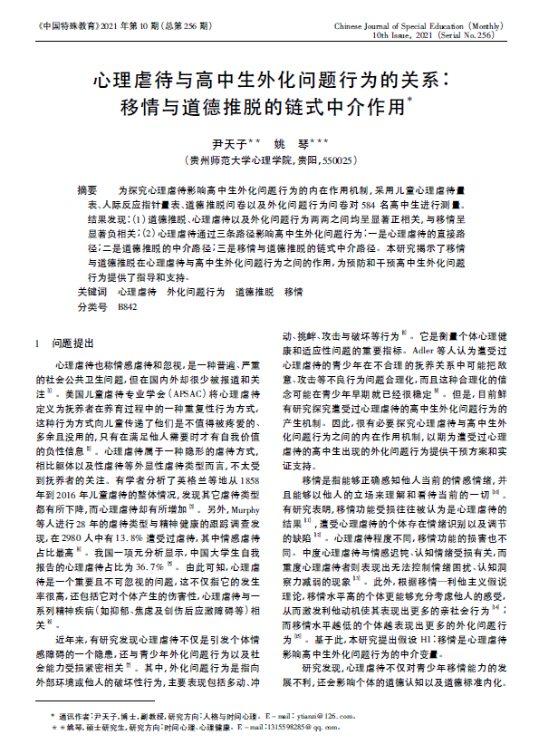 15.尹天子教授作为第一作者,2021年10月在CSSCI(扩展板)期刊《中国特殊教育》发表了题为“心理虐待与高中生外化问题行为的关系:移情与道德推脱的链式中介作用”的学术论文。