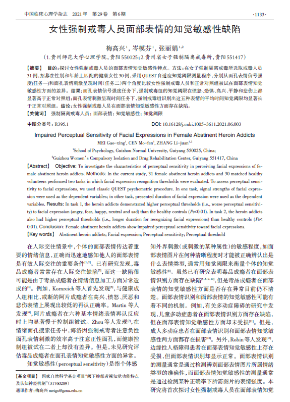 10.梅高兴教授作为第一作者,2021年12月在CSSCI期刊《中国临床心理学杂志》发表了题为“女性强制戒毒人员面部表情的知觉敏感性缺陷”的学术论文。