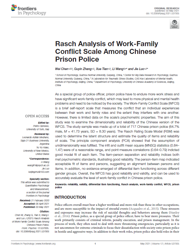 1.陈维教授作为第一作者,2021年5月在SSCIJCR二区期刊《Frontiersin Psychology》发表了题为“Rasch Analysis of Work-Family Conflict Scale among Chinese Prison Police”的学术论文。