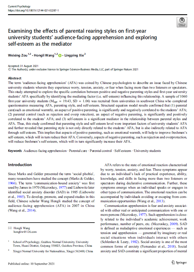 4.博士研究生邹维兴作为第一作者,王洪礼教授作为通讯作者,2021年9月在SSCIJCR一区期刊《Current Psychology》发表了题为“Examining the effects of parental rearing styles on first-year university students’ audience-facing apprehension and exploring self-esteem as the mediator”的学术论文。
