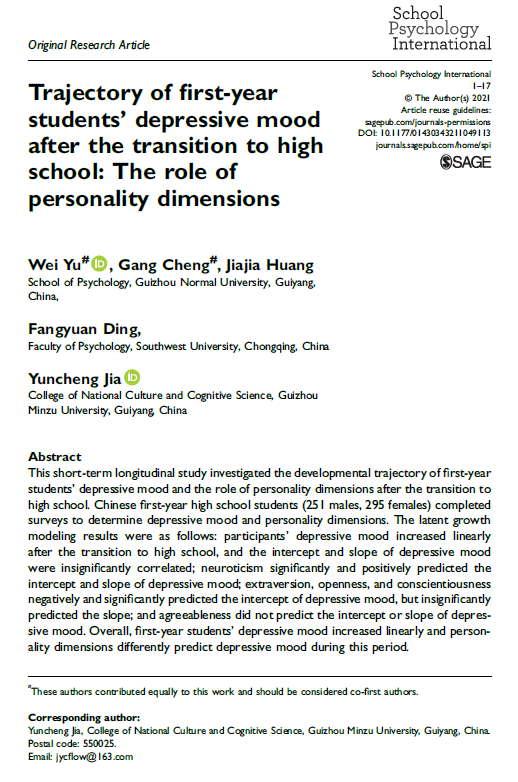 9.硕士研究生余玮作为第一作者,程刚教授作为通讯作者,2021年10月在SSCIJCR二区期刊《School Psychology International》发表了题为“Trajectory of first-year students' depressive mood after the transition to high school: The role of personality dimensions”的学术论文。