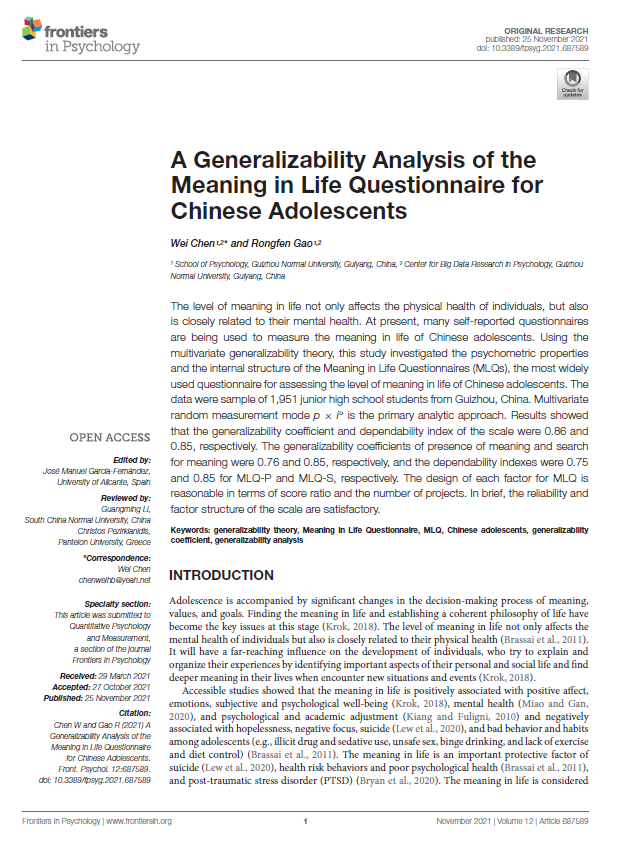 7.陈维教授作为第一作者,2021年11月在SSCIJCR二区期刊《Frontiers in Psychology》发表了题为“A Generalizability Analysis of the Meaning in Life Questionnaire for Chinese Adolescents”的学术论文。