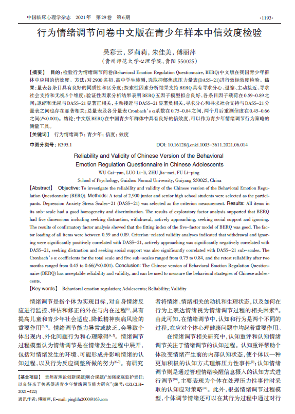 13.硕士研究生吴彩云作为第一作者,傅丽萍副教授作为通讯作者,2021年12月在CSSCI期刊《中国临床心理学杂志》发表了题为“行为情绪调节问卷中文版在青少年样本中信效度检验”的学术论文。