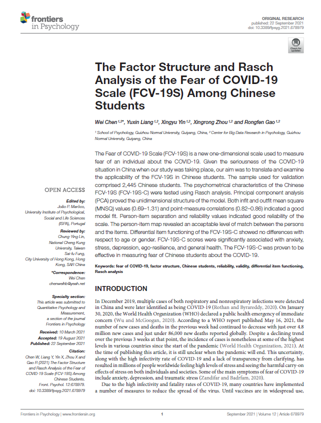 5.陈维教授作为第一作者,2021年9月在SSCIJCR二区期刊《Frontiers in Psychology》发表了题为“The factor structure and rasch analysis of the fear of covid-19 scale (fcv-19s) amongChinese students”的学术论文。