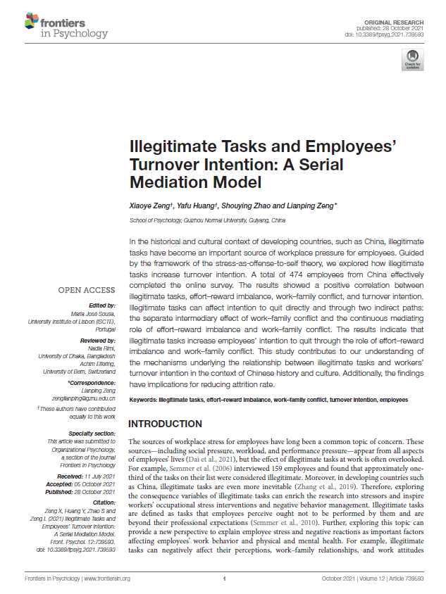 8.硕士研究生曾小叶和黄亚夫副教授作为共同第一作者,曾练平教授作为通讯作者,2021年10月在SSCIJCR二区期刊《Frontiers in Psychology》发表了题为“Illegitimate tasks and employees' turnover intention a serial mediation model”的学术论文。