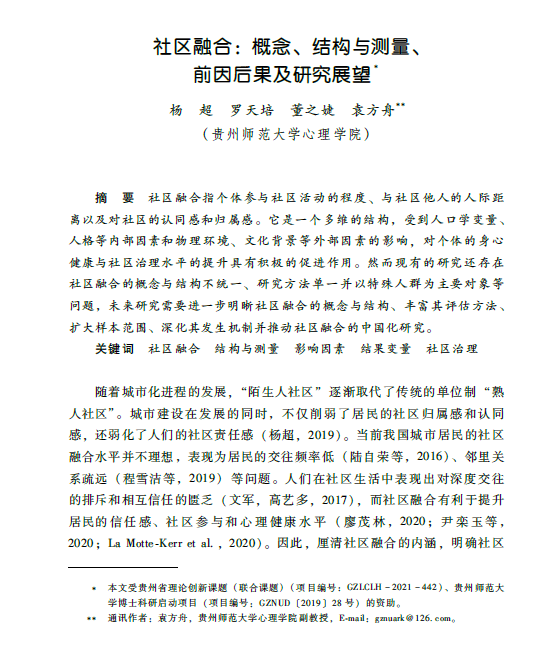 11.杨超博士作为第一作者,2021年12月在CSSCI期刊《社区心理学研究》发表了题为“社区融合:概念、结构与测量、前因后果及研究展望”的学术论文。