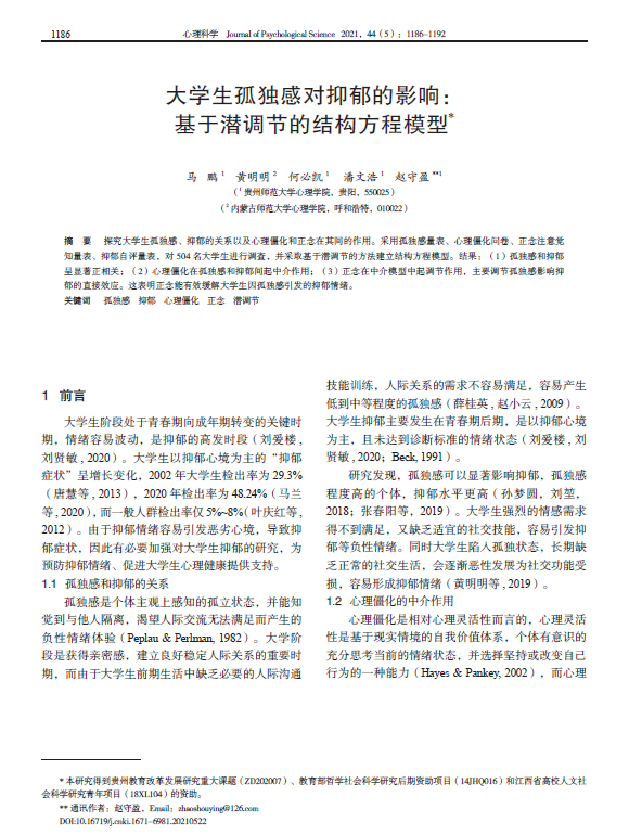 12.硕士研究生马鹏作为第一作者,赵守盈教授作为通讯作者,2021年9月在CSSCI期刊《心理学科学》发表了题为“老员工孤独感对抑郁的影响:基于潜调节的结构方程模型”的学术论文。