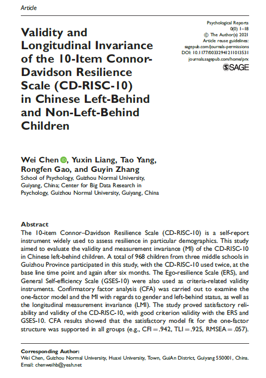 2.陈维教授作为第一作者,2021年5月在SSCIJCR三区期刊《Psychological Reports》发表了题为“Validity and Longitudinal Invariance of the 10-Item Connor-Davidson Resilience Scale (Cd-Risc-10) in Chinese Left-Behind and Non-Left-Behind Children”的学术论文。