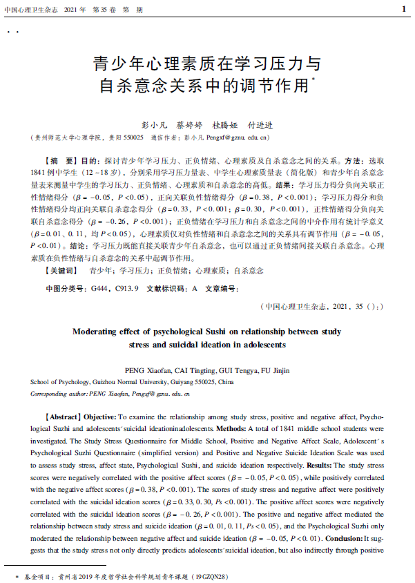 18.彭小凡副教授作为第一作者,2021年10月在CSCD期刊《中国心理卫生杂志》发表了题为“青少年心理素质在学习压力与自杀意念关系中的调节作用”的学术论文。