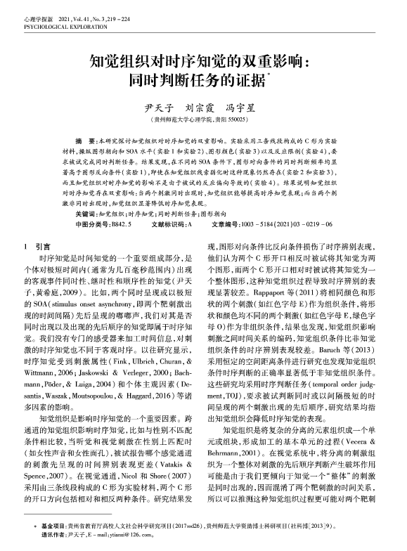 4.尹天子教授作为第一作者,2021年6月在CSSCI(扩展板)期刊《心理学探新》发表了题为“知觉组织对时序知觉的双重影响:同时判断任务的证据”的学术论文。